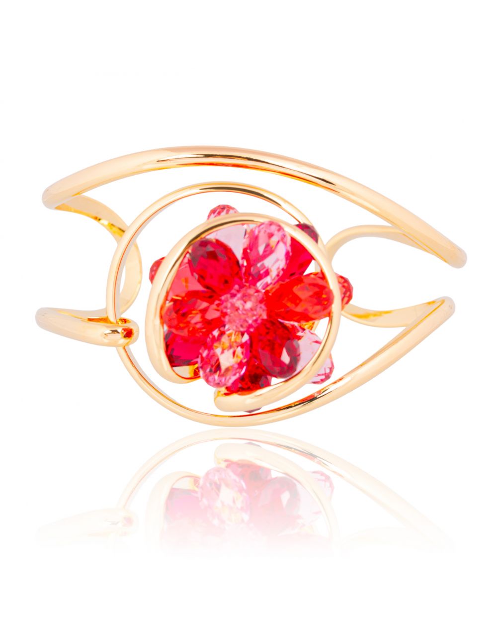 La structure en métal doré, aux lignes fluides et aériennes, entoure le cristal avec légèreté et met en valeur son éclat exceptionnel. Grâce à son bracelet ouvert et ajustable, ce bijou s’adapte naturellement à tous les poignets, offrant un confort optimal au quotidien.