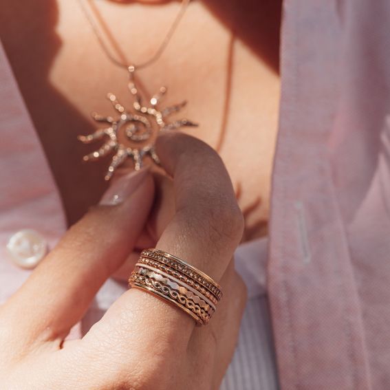 La bague de remplissage Marisol est une bague de marque iXXXi lisse de 2 mm de large, fabriquée en acier inoxydable avec un placage doré rose. Elle est ornée d’un motif raffiné en losanges.
