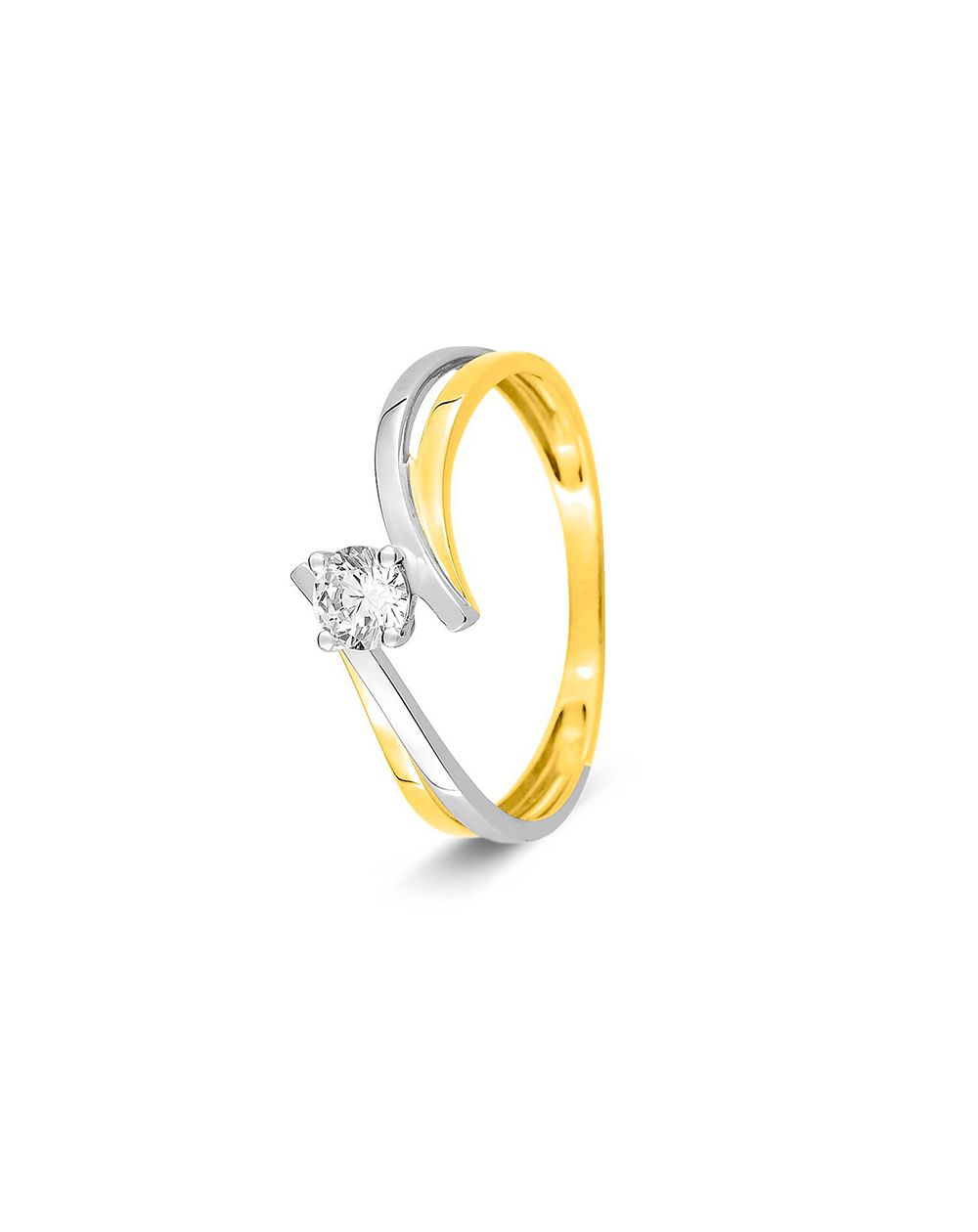 Cette bague de fiançailles solitaire est un solitaire toi et moi en or 9 carats bicolore avec une pierre en oxyde de zirconium.