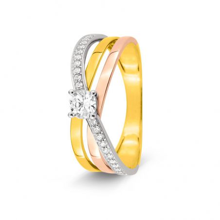 Ce solitaire en or 9 carats est un solitaire tricolore avec des pierres en oxyde de zirconium idéal pour des fiançailles ou pour se faire plaisir!