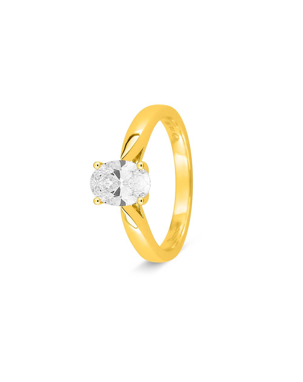 La monture en or jaune poli met en valeur la forme ovale du diamant, reconnue pour son effet visuel flatteur qui allonge la main. Le sertissage précis assure à la fois sécurité et finesse, pour un bijou confortable au quotidien.