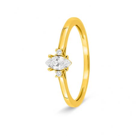 Cette bague en or jaune 375 (9 carats) séduit par son équilibre parfait entre finesse et éclat. Elle est sublimée par un diamant de laboratoire taille marquise de 0,22 carat, accompagné de diamants d’appoint pour un poids total de 0,24 carat. Un bijou lumineux, élégant, pensé pour traverser le temps sans jamais se démoder.