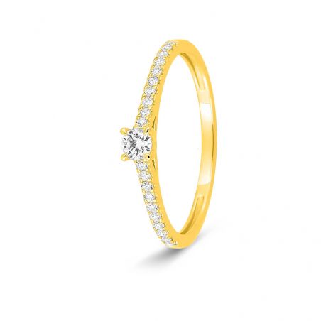 Délicate et lumineuse, cette bague en or jaune 375 (9 carats) séduit par son élégance intemporelle. Elle est ornée d’un diamant de laboratoire central de 0,10 carat, subtilement mis en valeur par un pavage de diamants le long de l’anneau, pour un poids total de 0,22 carat. Un design raffiné qui capte la lumière avec finesse.