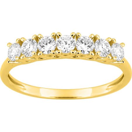 Élégante et intensément lumineuse, cette demi-alliance en or jaune 375 (9 carats) est sertie de 7 diamants de laboratoire soigneusement sélectionnés, pour un poids total de 0,50 carat. Leur disposition harmonieuse offre un équilibre parfait entre présence visuelle, raffinement et confort au porté.