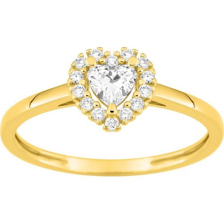 Romantique et éclatante, cette bague en or jaune 375 (9 carats) met en lumière un diamant de laboratoire taille cœur de 0,19 carat, sublimé par un entourage délicat de diamants pour un poids total de 0,29 carat. Le design halo accentue la brillance et donne une présence visuelle élégante, tout en conservant une grande finesse.