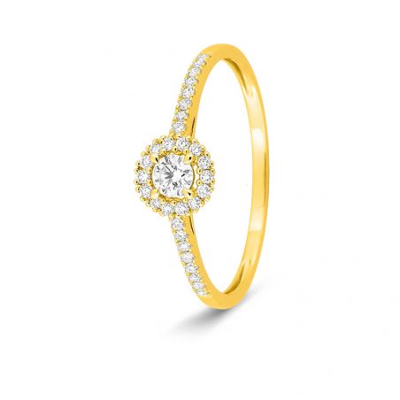 Délicate et éclatante, cette bague en or jaune 375 (9 carats) associe un diamant de laboratoire central de 0,10 carat à un entourage halo de diamants, prolongé par un pavage fin sur l’anneau. L’ensemble totalise 0,22 carat, offrant une brillance raffinée et une présence élégante sans excès.