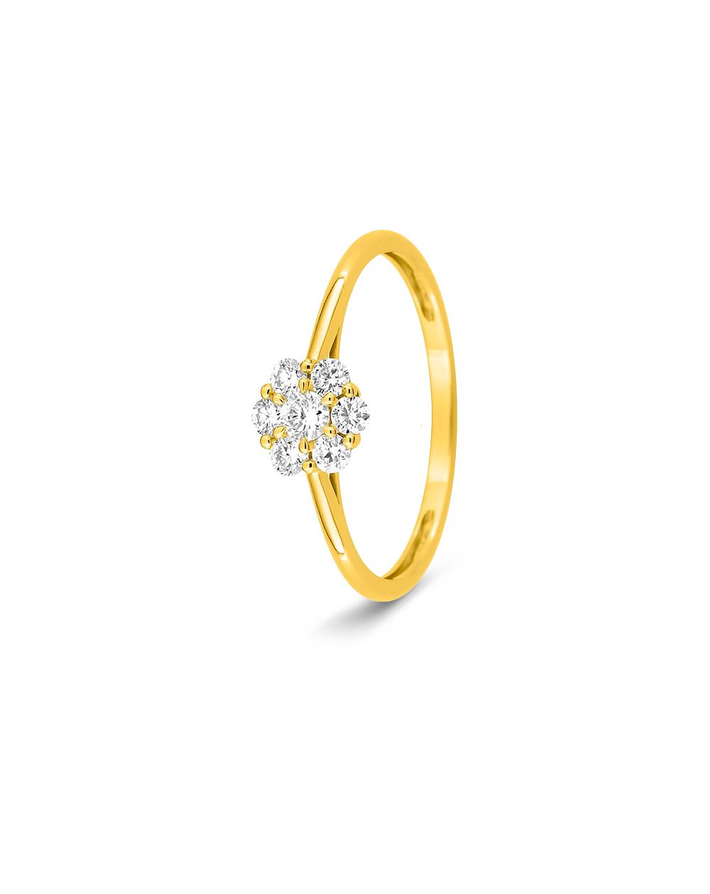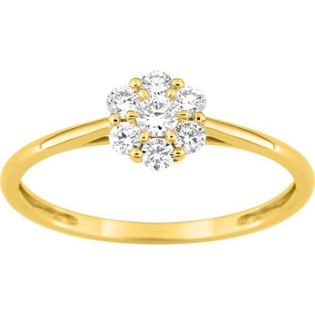 Délicate et lumineuse, cette bague en or jaune 375 (9 carats) séduit par son motif floral, composé de diamants de laboratoire soigneusement sertis pour former une fleur élégante et intemporelle. L’ensemble des pierres totalise 0,26 carat, offrant une brillance harmonieuse et féminine, idéale pour un bijou à porter au quotidien.