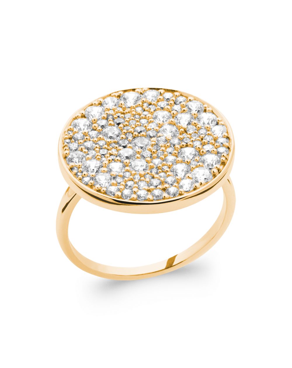 Cette bague séduisante présente un large pavé circulaire scintillant de multiples pierres en oxyde de zirconium, incrustées dans un arrangement dense qui capte la lumière sous tous les angles. Le serti est rehaussé par l'éclat chaud du plaqué or 18 carats qui enveloppe élégamment la monture et le corps de la bague, offrant une opulence luxueuse.