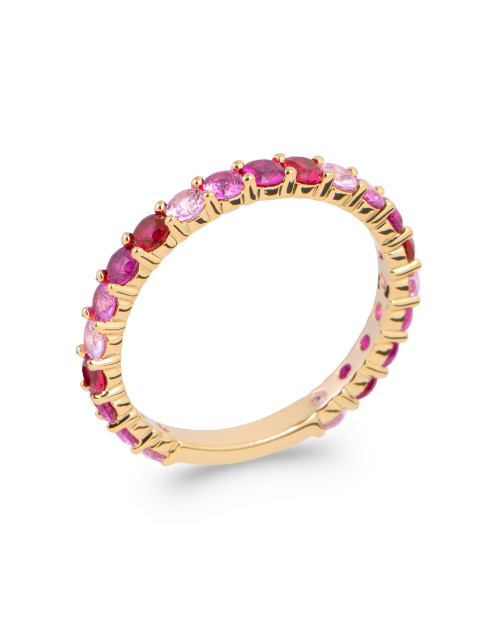 Les pierres incrustées tout autour de l'anneau sont des pierres en oxyde de zirconium, soigneusement sélectionnées pour leur éclat et leur ressemblance avec les pierres précieuses naturelles. Le dégradé de couleurs roses et rouges ajoute une touche vibrante et sophistiquée à cette bague intemporelle. Conçue pour les personnes recherchant à la fois la qualité et l'élégance, cette alliance américaine est parfaite à porter seule ou en complément d'autres bagues.