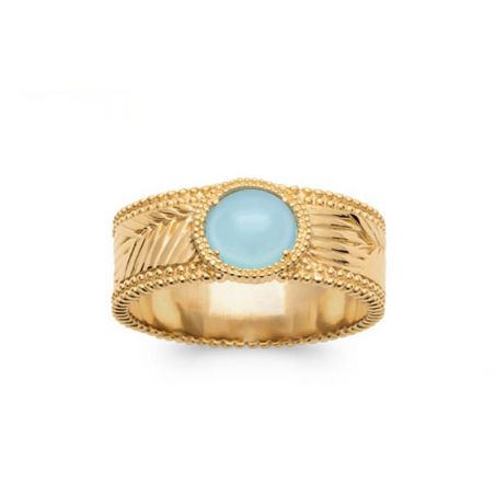 Bague en plaqué or avec une agate bleu sur une base large incrustée de feuilles, vous pouvez choisir votre taille.