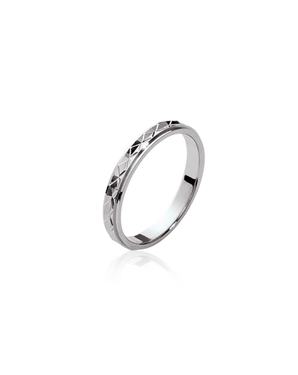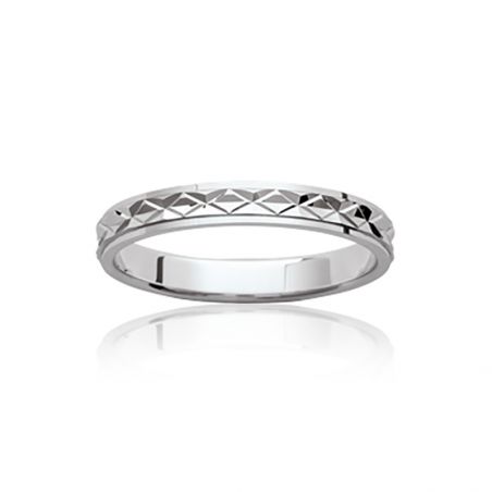 Cette alliance mixte mesure 3 mm de large et est fabriquée en argent 925 rhodié, offrant une élégance simple et moderne. Son design distinctif présente un motif croisé qui ajoute une touche de sophistication tout en restant discret.