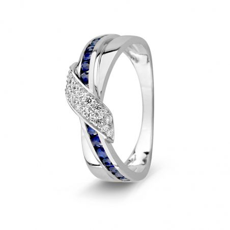 Cette bague en or blanc 9 carats est une bague dotée de saphirs et de pierres en oxyde de zirconium. Celle-ci peut être gravée à l'intérieur.