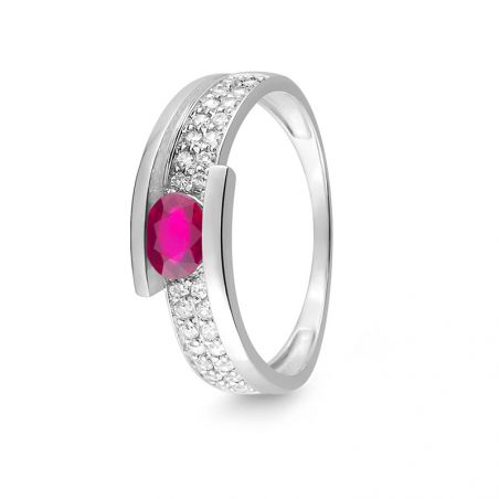 Cette bague en or blanc 9 carats est une bague dotée d'un grand rubis et de pierres en oxyde de zirconium. Celle-ci peut être gravée à l'intérieur.