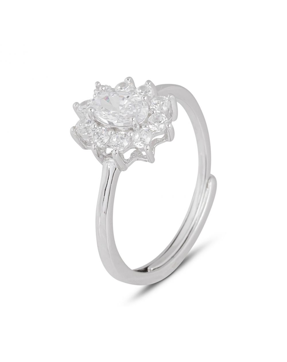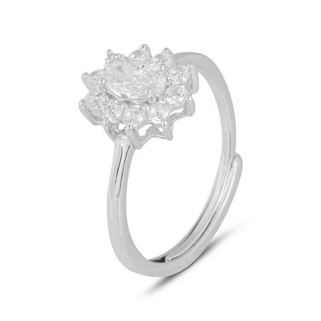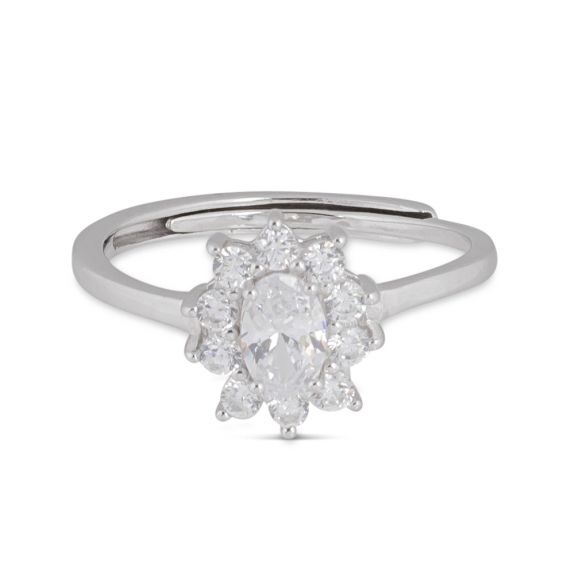 Cette bague en argent 925 est une bague Diana sertie de pierres en oxyde de zirconium.