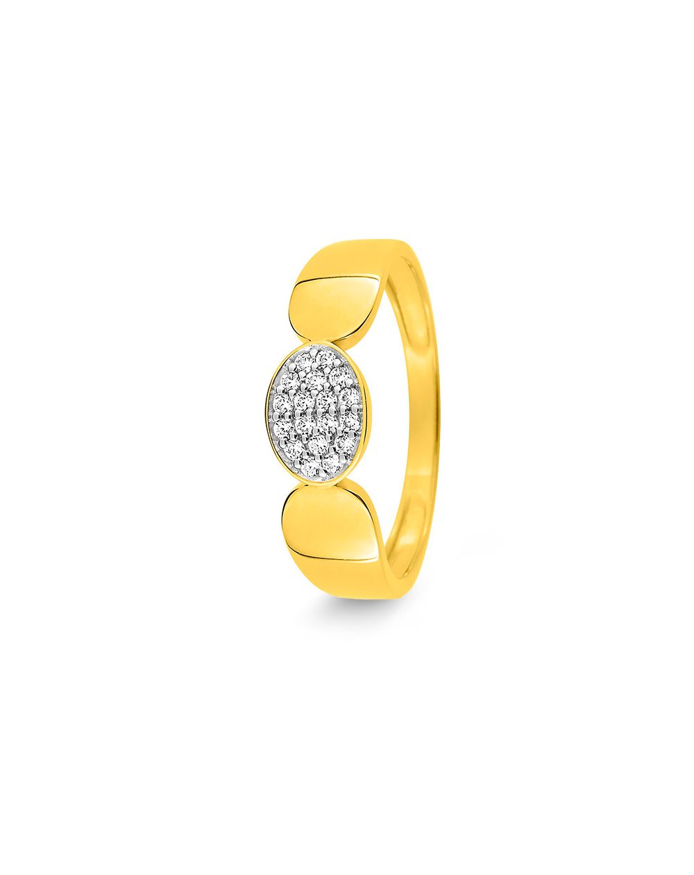 Cette bague en or jaune 9 carats est une bague dotée d'une pastille empierrée de pierres en oxyde de zirconium. Celle-ci peut être gravée à l'intérieur.