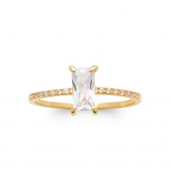 Cette bague plaquée or 18 carats de haute qualité est un fin solitaire serti d'une pierre rectangulaire mesurant 8mm de long sur 4mm de large. Le corps de la bague (mesurant 2mm) est également sertie de pierres en oxyde de zirconium.