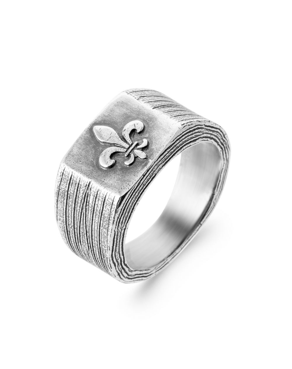 La bague présentée est en argent et arbore un large bandeau avec une texture qui imite les traits du bois ou un motif linéaire usé. Au centre, un symbole de fleur de lys, classique et élégant, est en relief, offrant un contraste net avec la texture de fond. Le design global est à la fois rustique et noble.