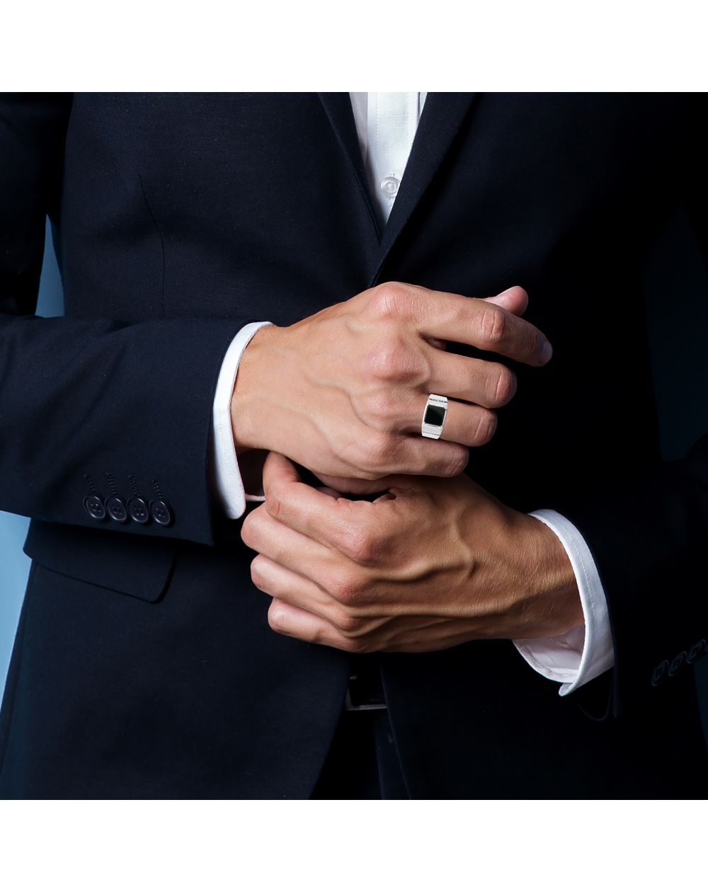 Bague argent avec agate noire rectangulaire, monture épurée, et détails rainurés sur les côtés.