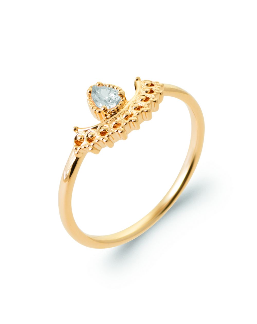 Cette bague en plaqué or se distingue par son design délicat et raffiné. Elle comporte un motif en forme de fer à cheval orné de petits cristaux étincelants, ajoutant une touche de brillance. Un petit pendentif rond suspendu, également serti d'un cristal, complète le design. Cette bague élégante et féminine est parfaite pour apporter une touche de glamour subtil à n'importe quelle tenue.