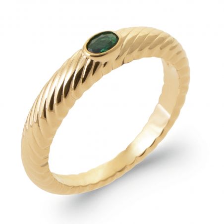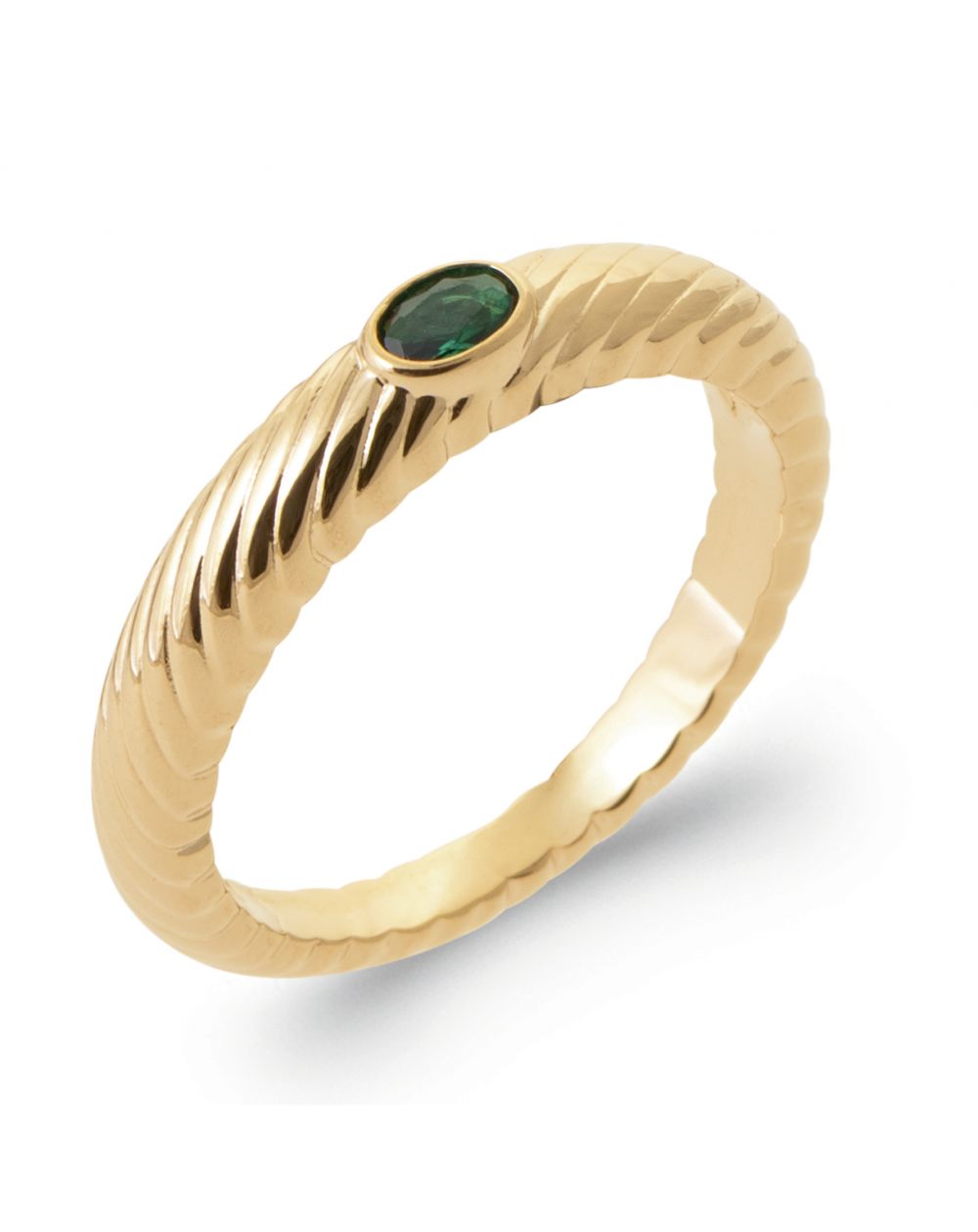 Bague solitaire torsadée – Éclat émeraude et finesse dorée