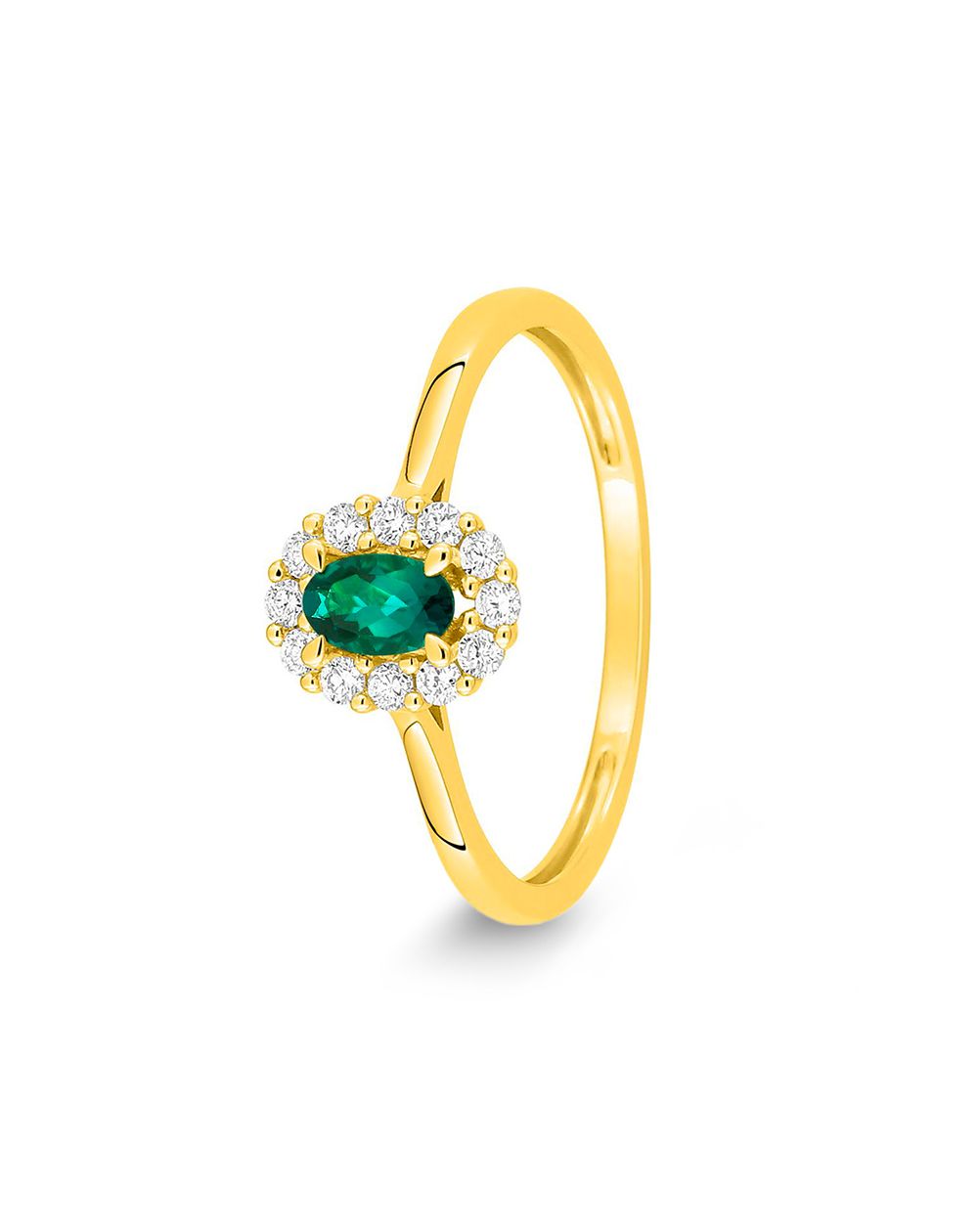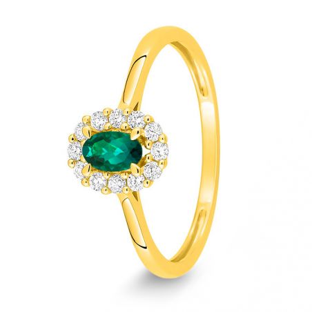 Cette bague en or jaune 9 carats est un solitaire emeraude serti de diamants de 0,16ct. La pierre est une émeraude naturelle mesurant environ 4mm sertie au milieu de la bague or.