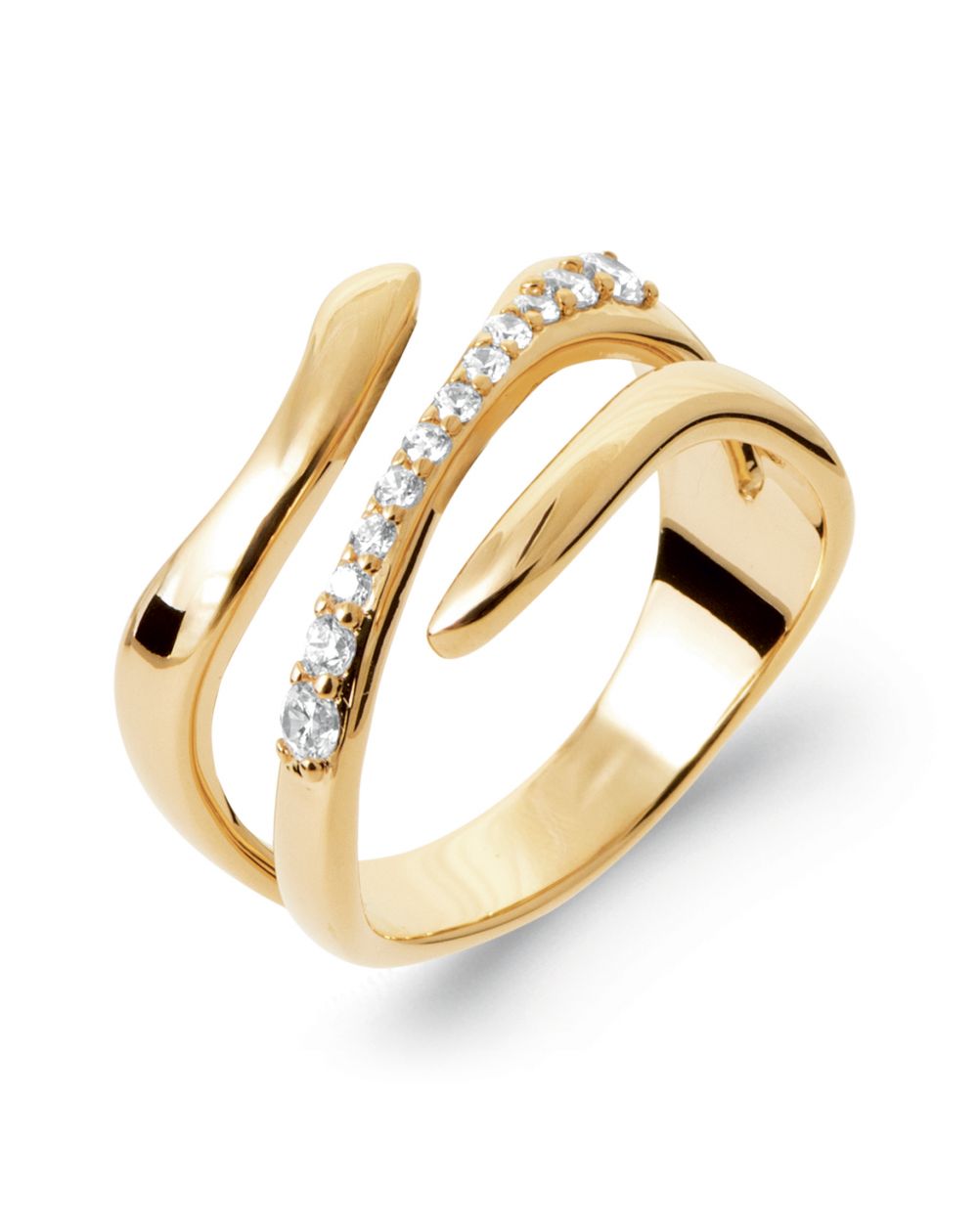Lumineuse et raffinée, cette bague dorée plaquée or 18 carats séduit par son design fluide et contemporain. Ses trois branches délicatement entrelacées dessinent une courbe harmonieuse qui épouse parfaitement le doigt. L’une d’elles est sublimée par une rangée d’oxydes de zirconium étincelants, offrant un éclat comparable à celui du diamant.
