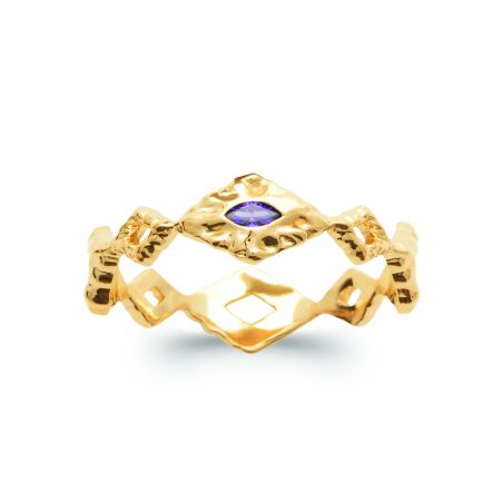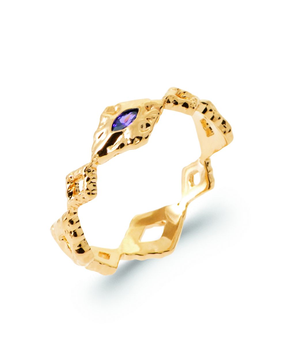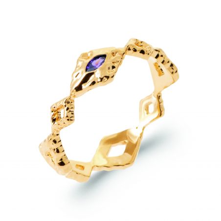 La bague Mystic Serpentina séduit par son design sculpté aux allures d’amulettes anciennes. Ses motifs martelés, sa forme ondoyante et sa pierre violette en taille marquise lui donnent un charme mystique et précieux. En plaqué or 18k, elle dégage une aura bohème et envoûtante, parfaite pour sublimer une main avec caractère. Garantie 10 ans sur le plaquage.