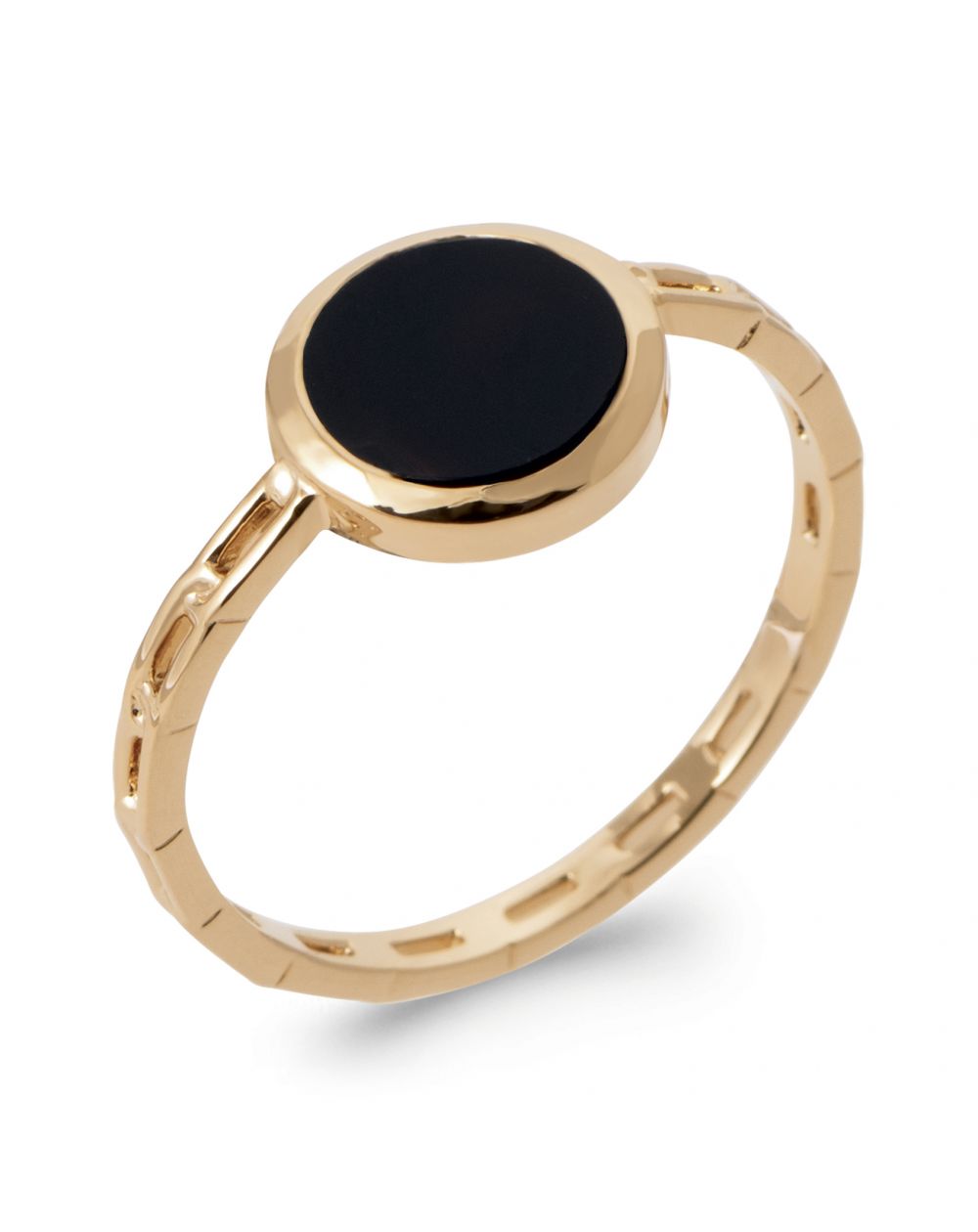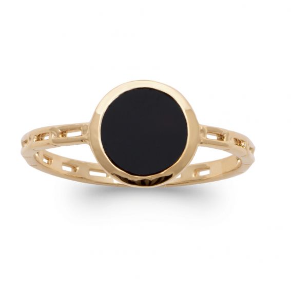 La monture en plaqué or 18 carats offre un éclat lumineux et durable, contrastant harmonieusement avec l’intensité de la pierre noire. Son anneau fin, délicatement ajouré, assure un confort optimal tout en apportant une touche moderne et féminine au design.