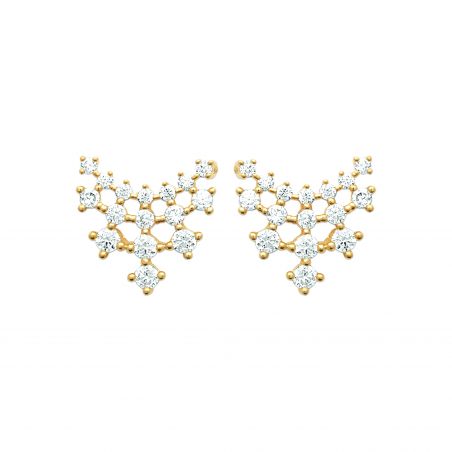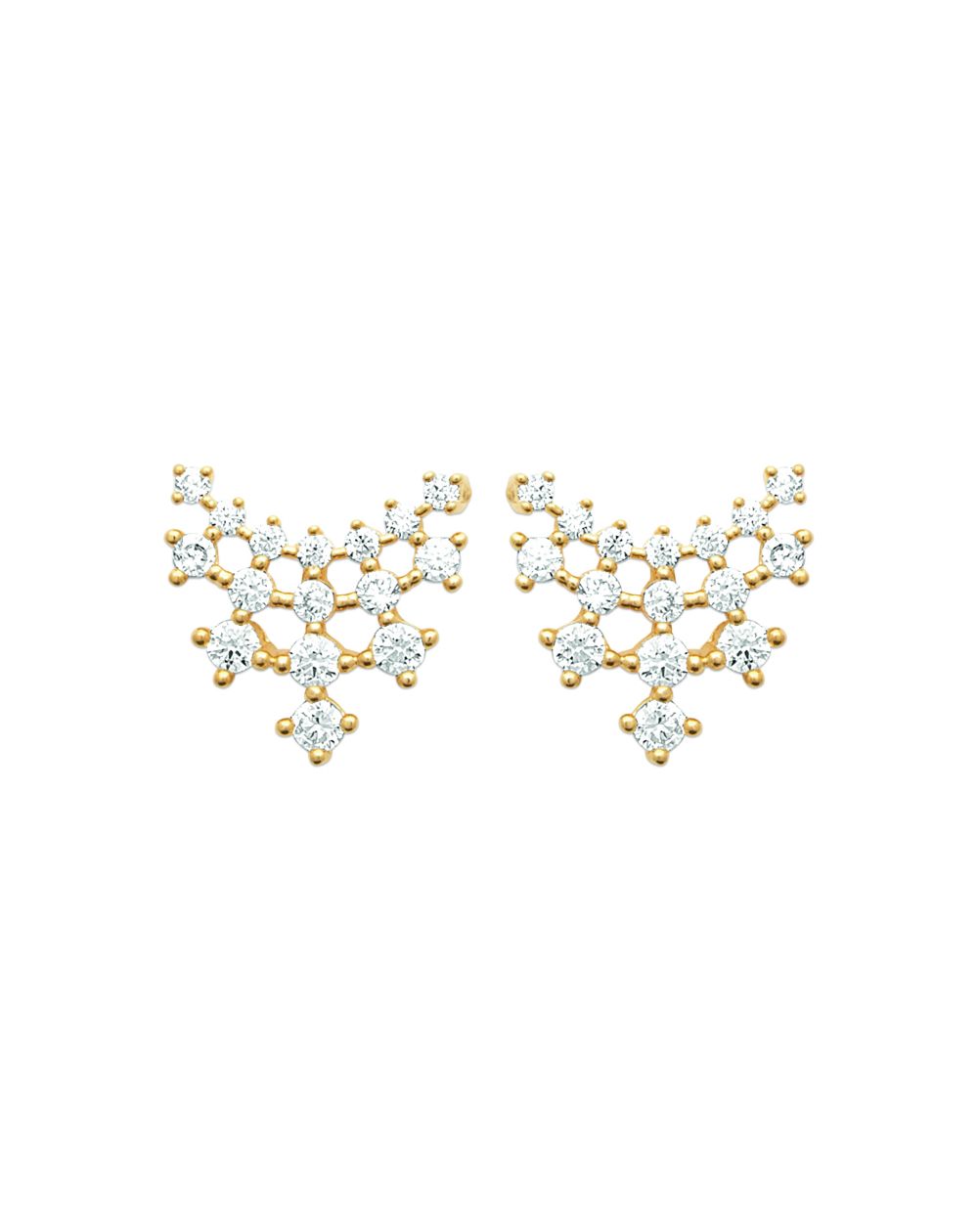 Asteria évoque les étoiles et les constellations. Le design graphique serti de zircons rappelle un ciel étoilé structuré, délicat et lumineux — parfaitement aligné avec l’aspect joaillier et moderne de ces boucles d’oreilles.