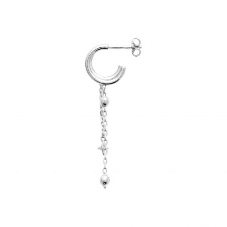 Composée d’une créole fine en argent 925, elle se prolonge par une double chaîne délicate, ponctuée d’une perle brillante et d’une petite étoile.