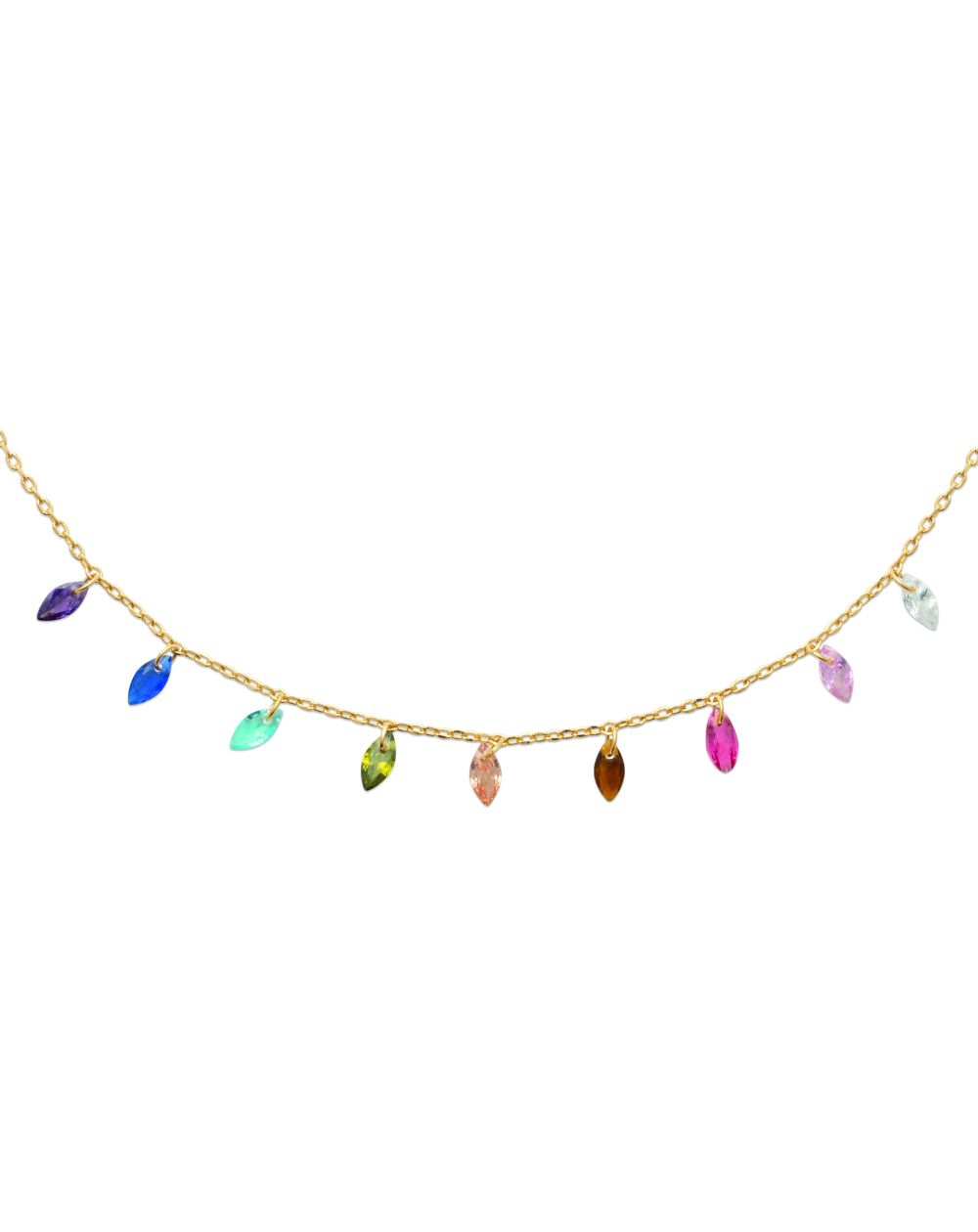 Monté sur une chaîne fine de 45 cm réglable, ce collier s’adapte parfaitement à votre morphologie et permet un porté ajusté, idéal seul ou en accumulation. Ses petits pendentifs colorés en forme de navette captent la lumière et offrent un rendu subtil, à la fois moderne et raffiné.