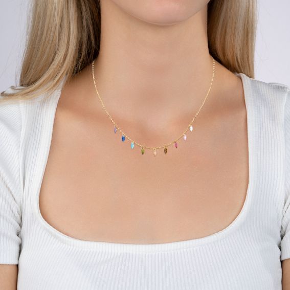 Apportez une touche de couleur et de finesse à votre style avec ce collier à pendentifs multicolores en plaqué or 18 carats, une pièce délicate et lumineuse qui sublime le décolleté avec élégance.