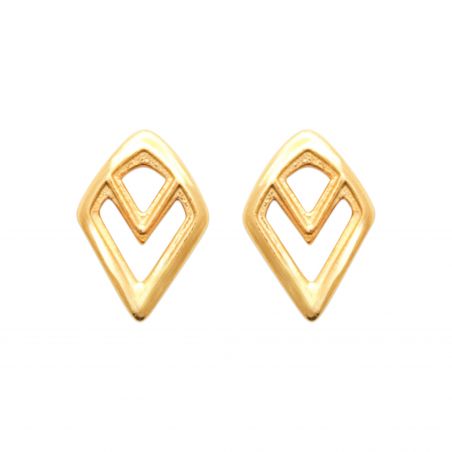 Affirmez votre style avec les boucles d’oreilles Oranis, une création au design graphique et contemporain. Réalisées en plaqué or 18 carats, elles se distinguent par leurs formes géométriques en double losange ajouré, offrant un jeu de lignes élégant et structuré.