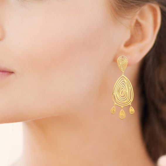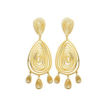 Sublimez votre style avec les boucles d’oreilles Oria, une création élégante et artistique au design ajouré. Réalisées en acier inoxydable doré, elles reprennent un motif en forme de goutte aux lignes concentriques, accompagné de trois pampilles mobiles, pour un effet léger et plein de mouvement.