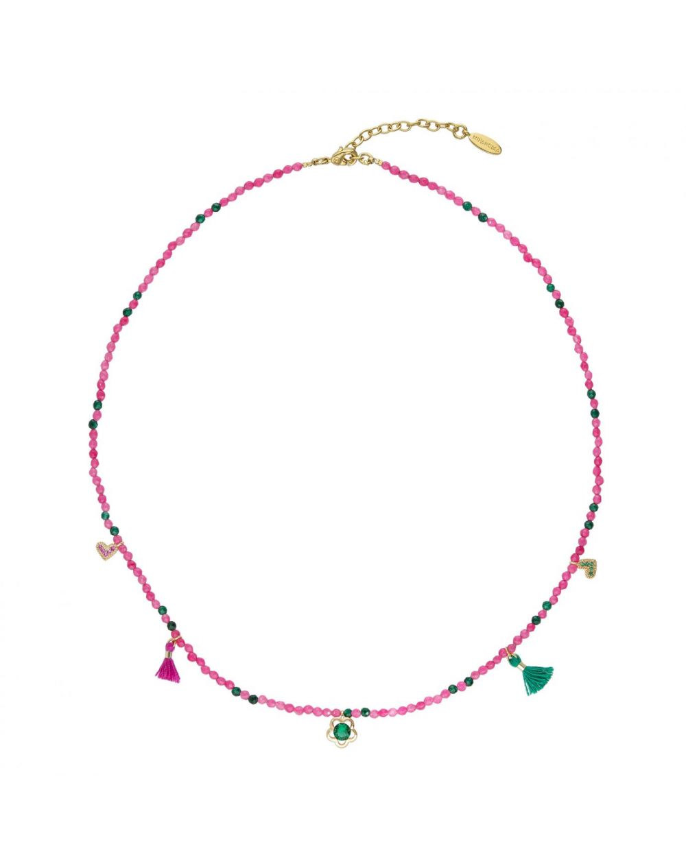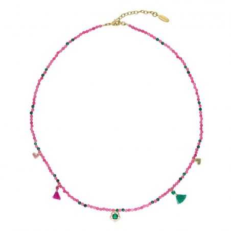 Ce collier de la marque Hipanema est un ras de cou doré à l'or fin 14 carats composé de très petites pierres semi-précieuses de couleur rose fuchsia et vert émeraude, et de cinq petites pampilles: deux petits coeurs pavés de strass, l'un de couleur rose rubis et l'autre de couleur vert émeraude, une petite fleur au centre ornée d'un strass couleur vert émeraude ainsi que deux petits pompons aux couleurs rose indien et vert, très automnales. Une pièce raffinée dans le pur style d'Hipanema.