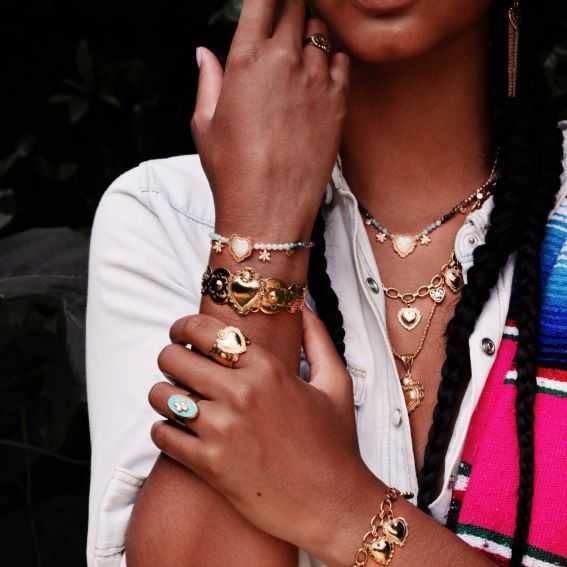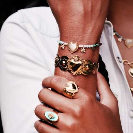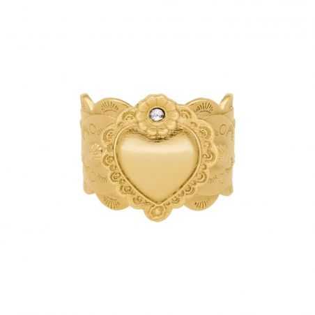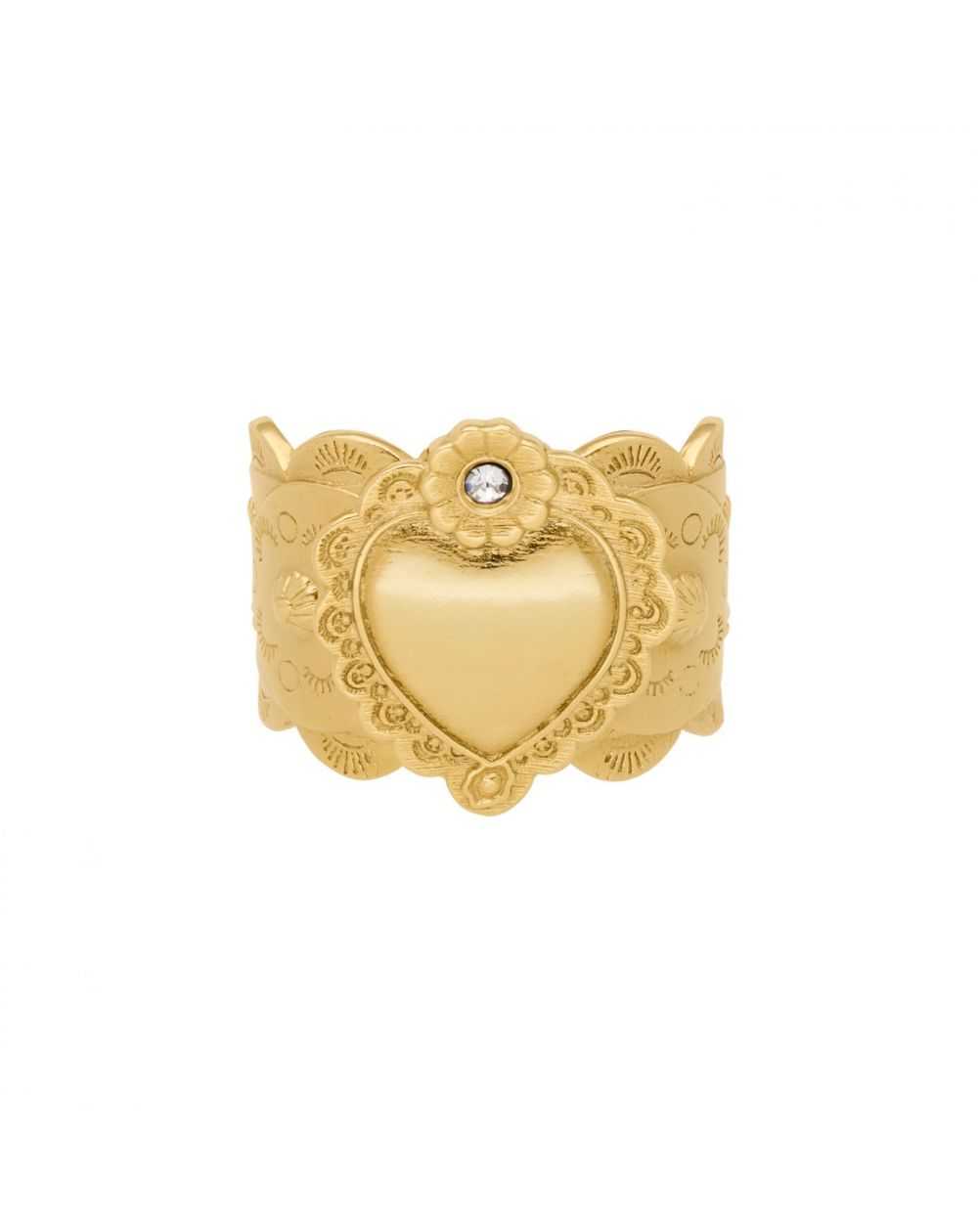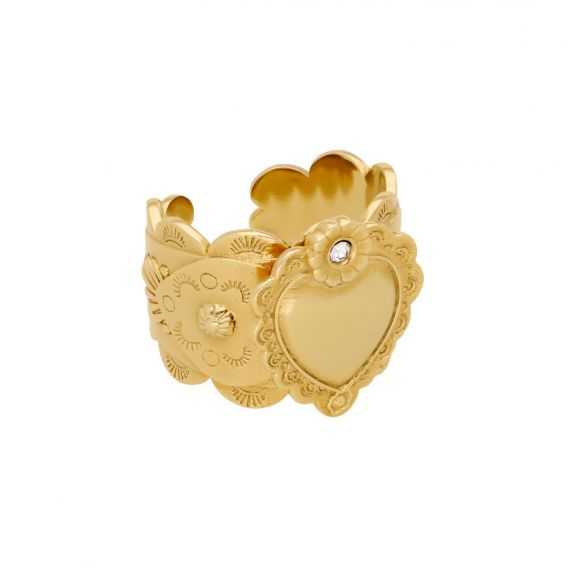Cette bague de la marque Hipanema est ouverte à l’arrière, pour plaire au plus grand nombre! La Chavez dorée à l’or fin reprend les symboles d’inspiration Nouveau-Mexique, interprétés de manière baroque, tout en ostentation et raffinement. Au centre, on retrouve un cœur ex-voto entouré de deux petites fleurs au cœur strassé effet diamant. Ce bijou entièrement fait à la main présente un corps de bague martelé, découpé en festons, travaillé de façon très ethnique, dans une déclinaison des symboles Navajo sculptés à l’intérieur.