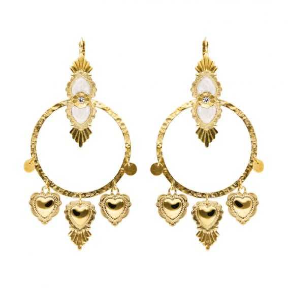 Ces boucles d'oreilles de la marque Hipanema sont des créoles pour oreilles percées dorées à l’or fin, munies d’une attache dormeuse. La tête de boucle est composée de deux cœurs inversés en résine nacrée, martelés, travaillés de style baroque sur un anneau créole orné de pampilles breloques dorées: des petits cœurs et sequins d’inspiration Amérique Latine. On craque pour cette association de couleurs entre nacre et effet or dans un esprit Nouveau-Mexique.