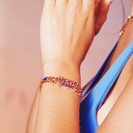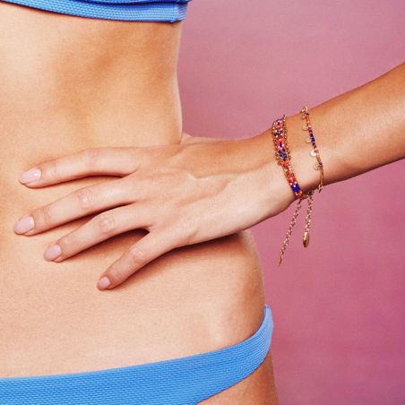 Ce bracelet Hipanema est tissé, avec un précieux montage de fermoir mousqueton, doré à l’or fin 18 carats. En son centre, on retrouve un motif tissé d’inspiration ethnique où se mêlent des perles Miyuki, dans des déclinaisons de Bleu Klein, rose, rouge orangé bambou de mer, à des perles facettées semi-précieuses en hématite, lapis lazuli, grenat orange, ainsi que de microscopiques perles en bout de bracelet. Hipanema innove ici avec un tissage très élégant et original pour ce bracelet fait à la main.