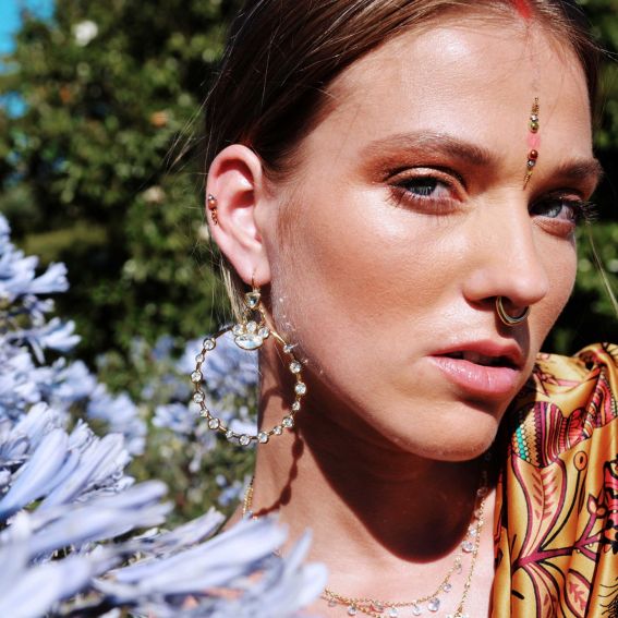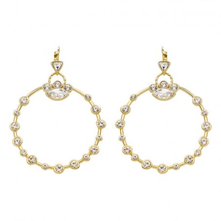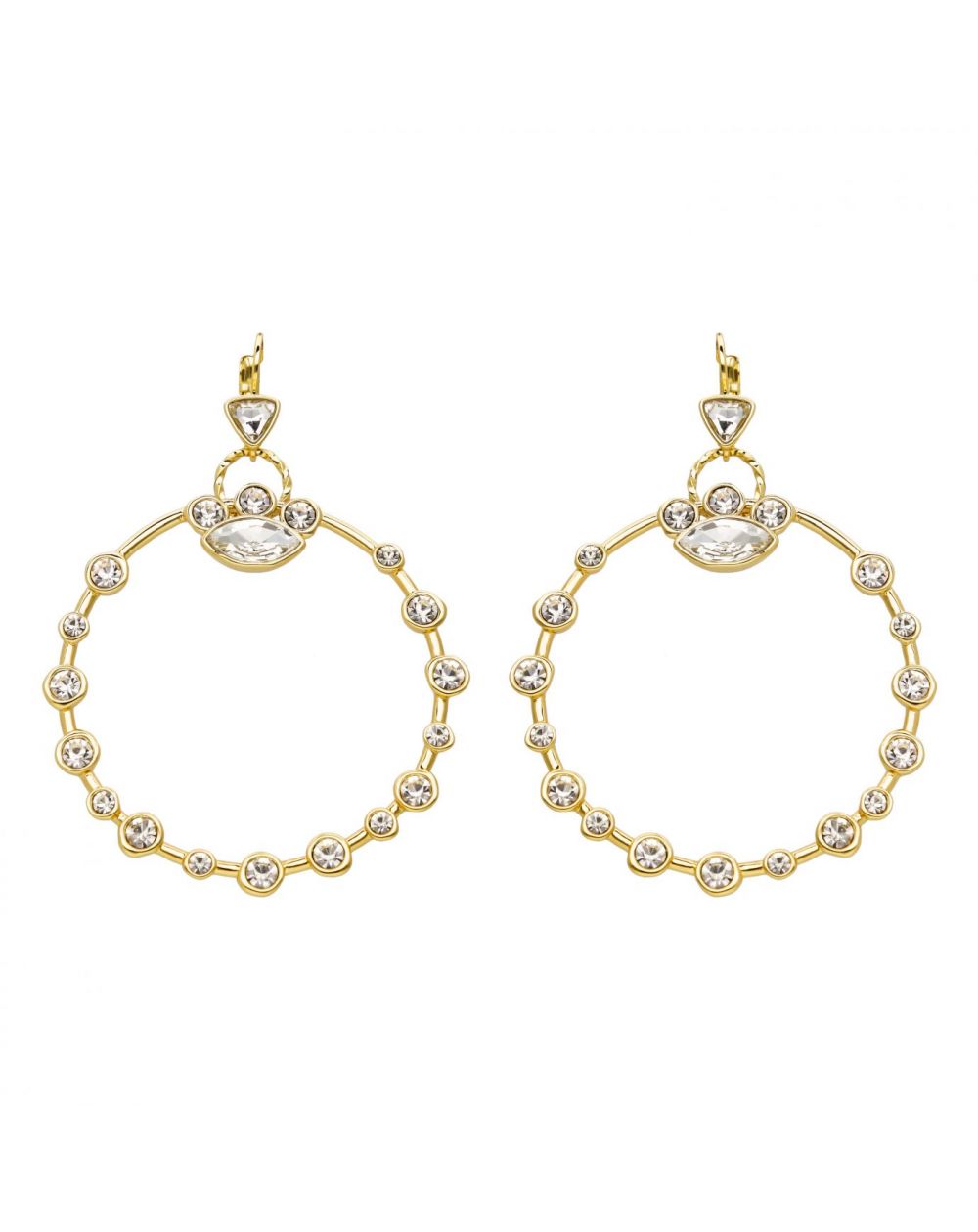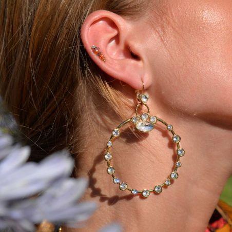 Boucles d'oreilles de la marque Hipanema. Direction Bollywood avec ces extravagantes créoles strassées! Boucles d'oreilles en créoles dorées à l’or fin 14 carats, montées sur dormeuse pour oreilles percées, avec une tête de boucle forme œil ornée de cils en strass. La créole est ouvragée de strass ronds effet diamant. Ce bijou est fait à la main.