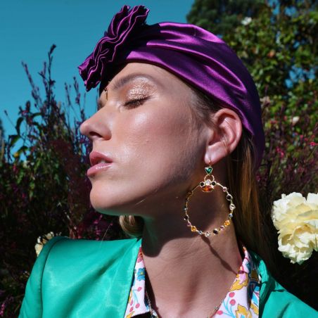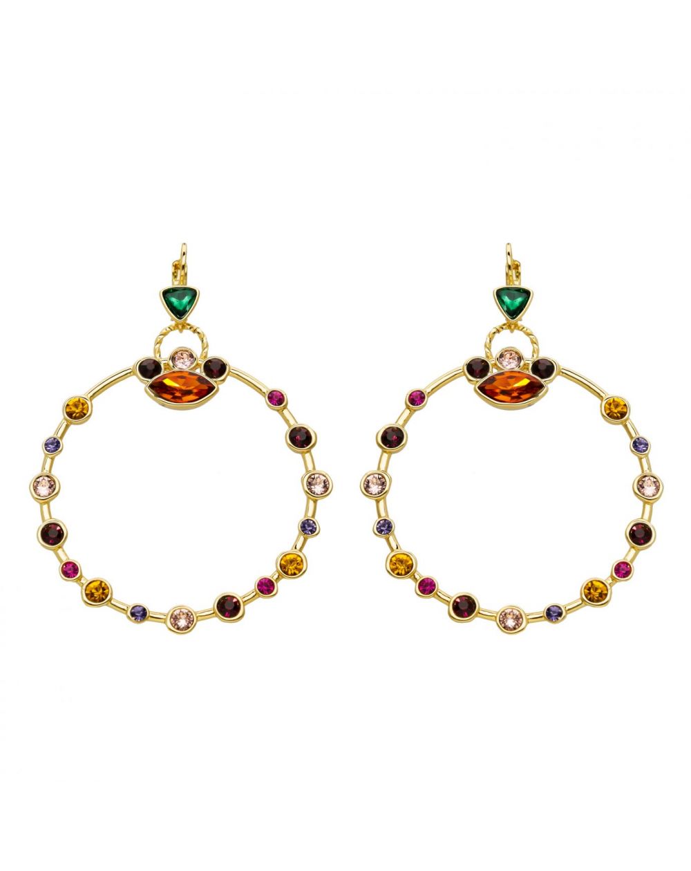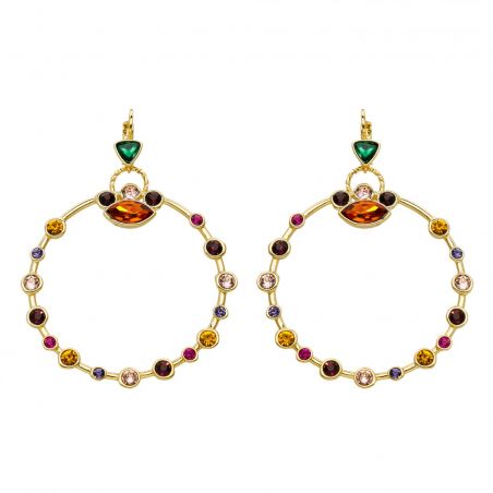 Boucles d'oreilles de la marque Hipanema. Direction Bollywood avec ces extravagantes créoles strassées! Boucles d'oreilles en créoles dorées à l’or fin 14 carats, montées sur dormeuse pour oreilles percées, avec une tête de boucle forme œil ornée de cils en strass. La créole est ouvragée de strass ronds multicolores: jaune effet citrine, fuchsia effet rubis, rose effet morganite, violet effet améthyste. Ce bijou est fait à la main.