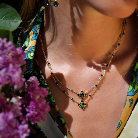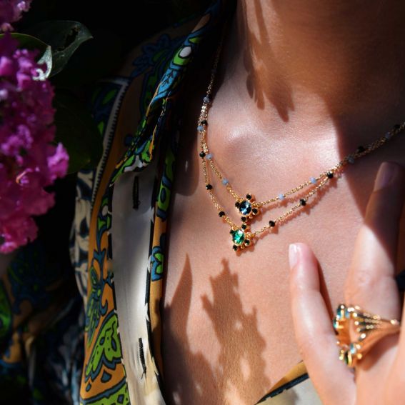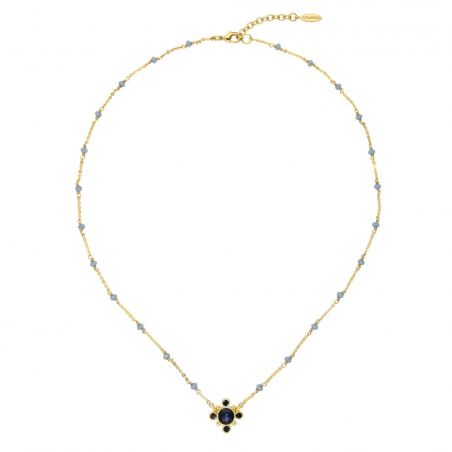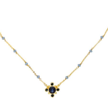 Ce collier de la marque Hipanema est un ravissant collier monté sur une chaîne chapelet en laiton doré à l’or fin 14 carats, composée de perles de verre facettées bleues.
