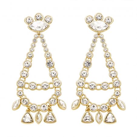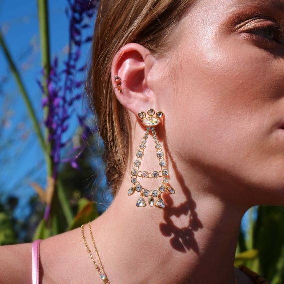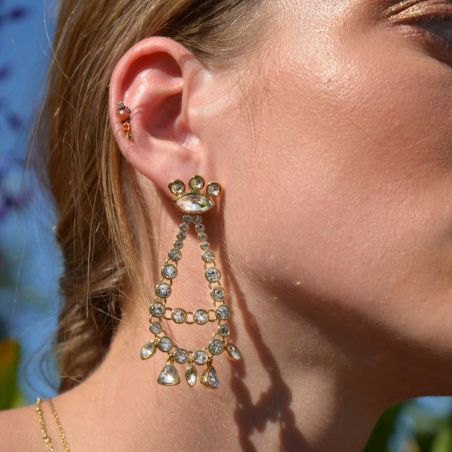 Boucles d'oreilles de la marque Hipanema. Révélez la diva qui sommeille en vous! Boucles d’oreilles hyper clinquantes, dorées à l’or fin 14 carats, pour un effet dérisoire chic. On retrouve une cascade de strass en ovales effet diamant, avec des formes différentes, à mi-chemin entre diva hollywoodienne et bollywoodienne.