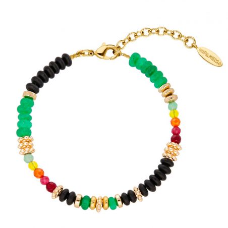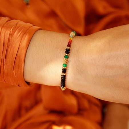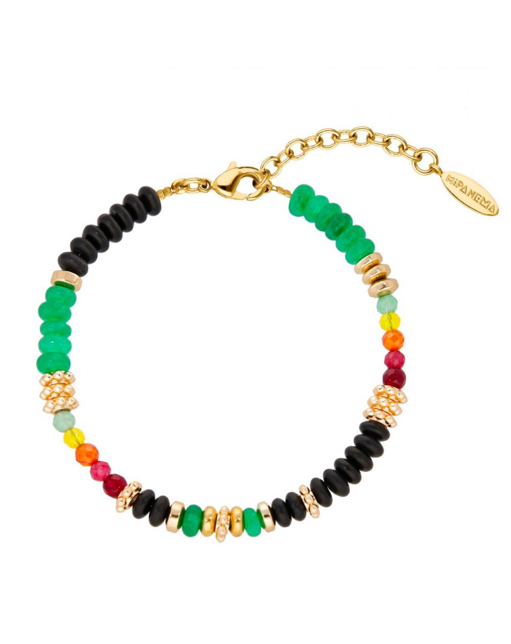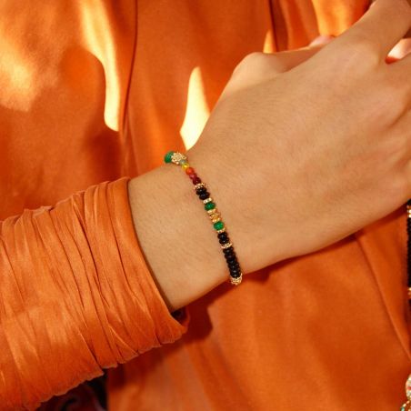 Ce bracelet Hipanema est un ravissant petit bracelet doré à l’or fin 14 carats, en pierres semi-précieuses agate noire, quartz teinté, aventurine verte, que l’on retrouve dans des tons noir, vert, orangé, jaune, un dégradé savamment composé jusqu’au rose et grenat.