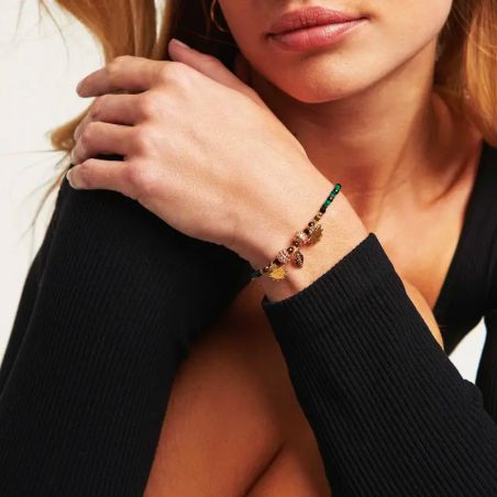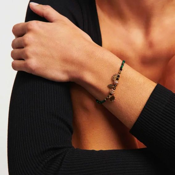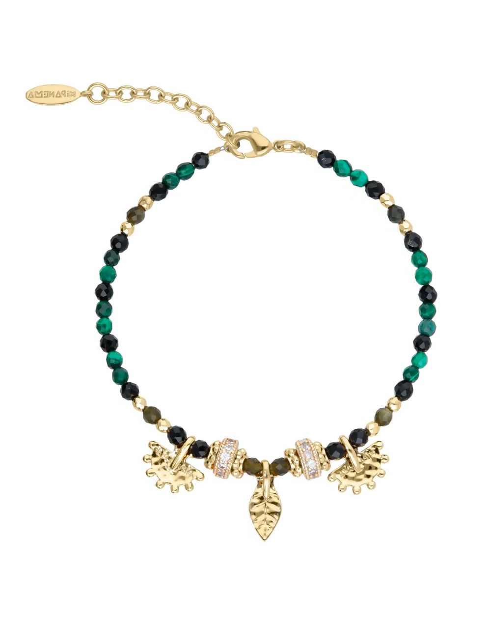 Ce bracelet Hipanema est un ravissant petit bracelet doré à l’or fin 14 carats, en pierres semi-précieuses dans les tons émeraudes et noirs.