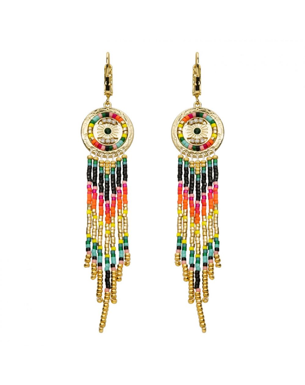 Boucles d’oreilles montées sur dormeuses pour oreilles percées, en laiton doré à l’or fin 14 carats. On adore ce disque solaire multicolore ouvragé à la main qui reprend un arc-en-ciel saturé, paré de petits strass, et orné au centre d’un strass effet émeraude.