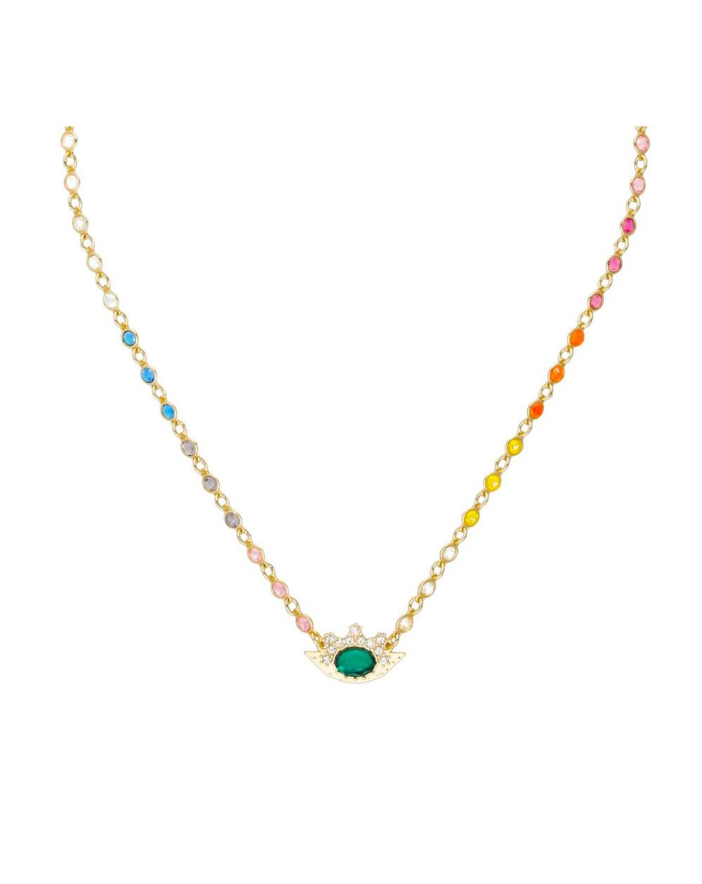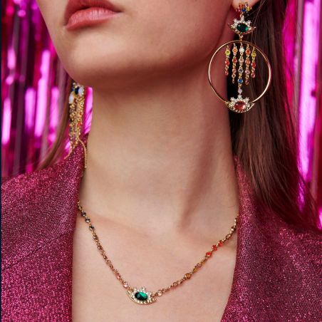 Ce collier de la marque Hipanema est un ras de cou en laiton doré à l’or fin 14 carats, monté sur une chaîne chapelet avec des pampilles en dégradé de couleurs, avec au centre l’œil protecteur orné d’une résine effet émeraude, orné de strass effet diamant.