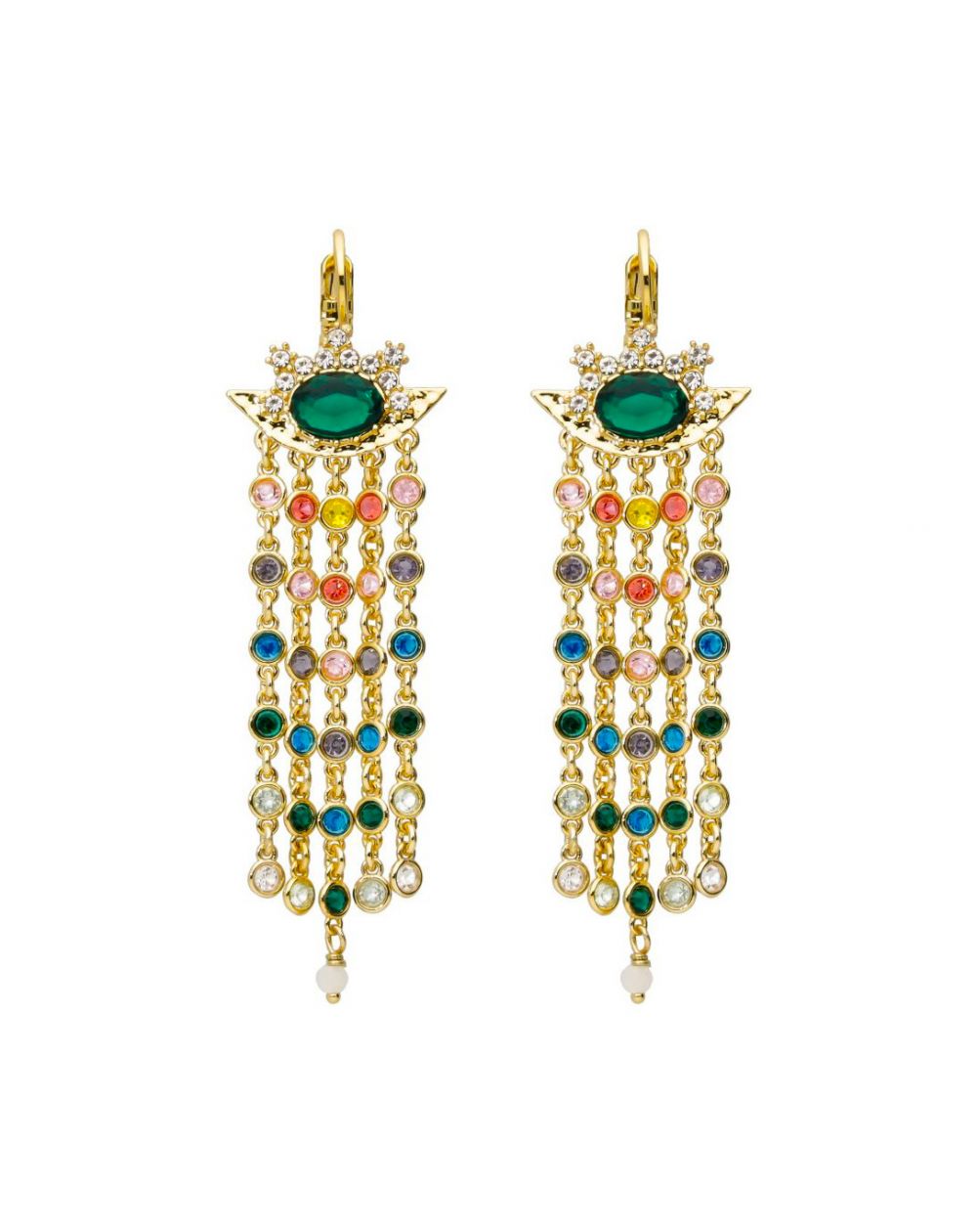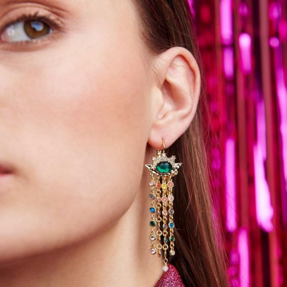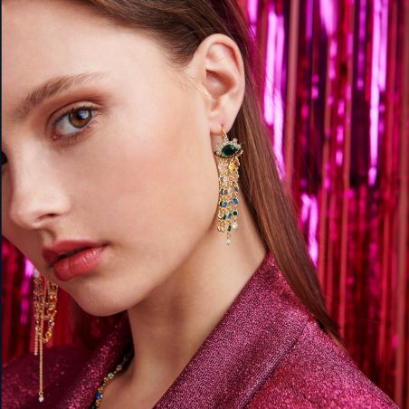 Boucles d'oreilles de la marque Hipanema. Lassez-vous séduire par ces somptueux pendants d’oreilles dorés à l’or fin 14 carats avec une cascade de chaînes multicolores effet arc-en-ciel. En tête de boucle, on retrouve une couronne strassée qui domine une sorte d’œil protecteur, paré d’une pierre verte effet émeraude. L'accroche est une dormeuse pour oreilles percées. On aime ce bijou fantaisiste d’exception, qui nous invite au voyage entre l’Italie du Sud et Rio de Janeiro.