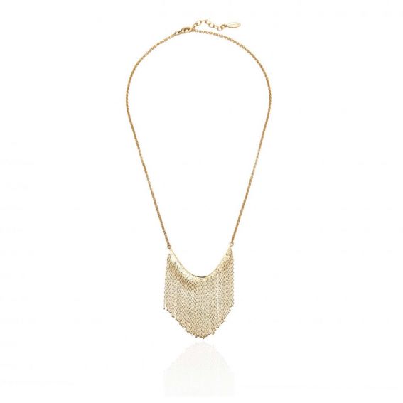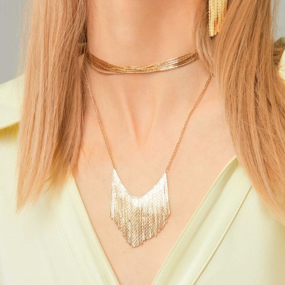 Collier très délicat doré à l’or fin 14 carats, monté sur une chaîne forçat, de taille intermédiaire, avec en son centre une cascade d’élégantes chaînes fines. À porter en accumulation.