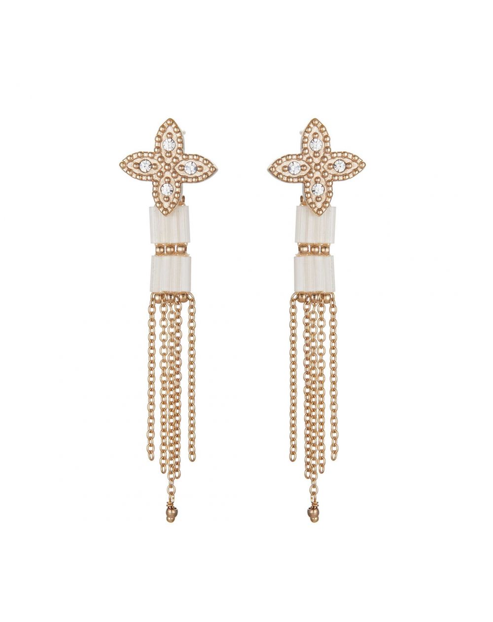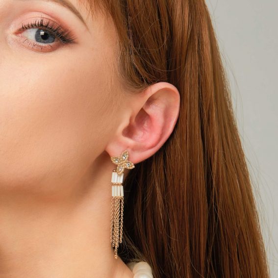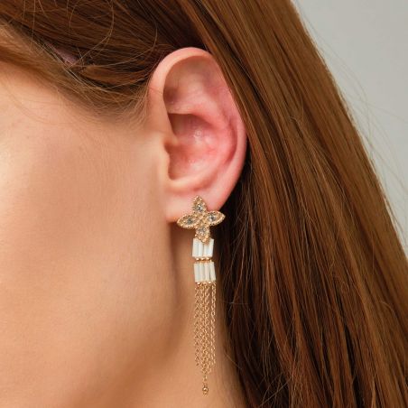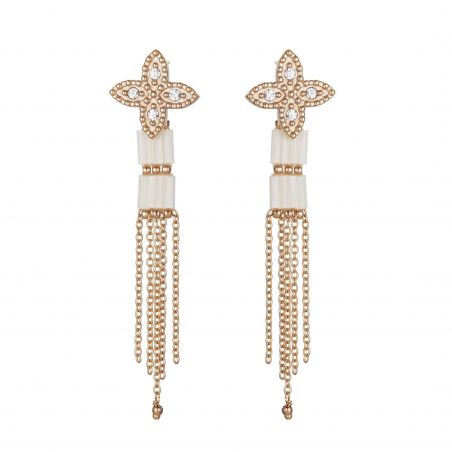 Pendants d’oreilles avec en tête de boucles un trèfle à quatre feuille allongé, ouvragé de petits strass, surplombant des cascades de cinq chaînes, composées de perles tubes effet nacré et des petites perles dorées. On aime ces boucles d’oreilles au rendu sexy et féminin.
