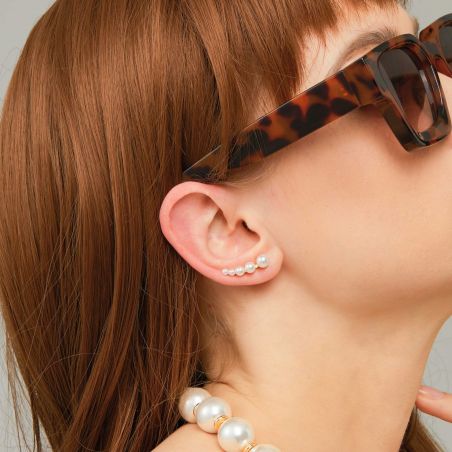 Préparez votre wedding season avec nos élégantes boucles d'oreilles en vermeil Jila: leur léger arrondi suit délicatement le lobe de l’oreille, et sont ornées de cinq perles de culture en dégradé, de la plus grande à la plus petite qui part en point de fuite. Une pièce au raffinement intemporel avec une touche créateur.